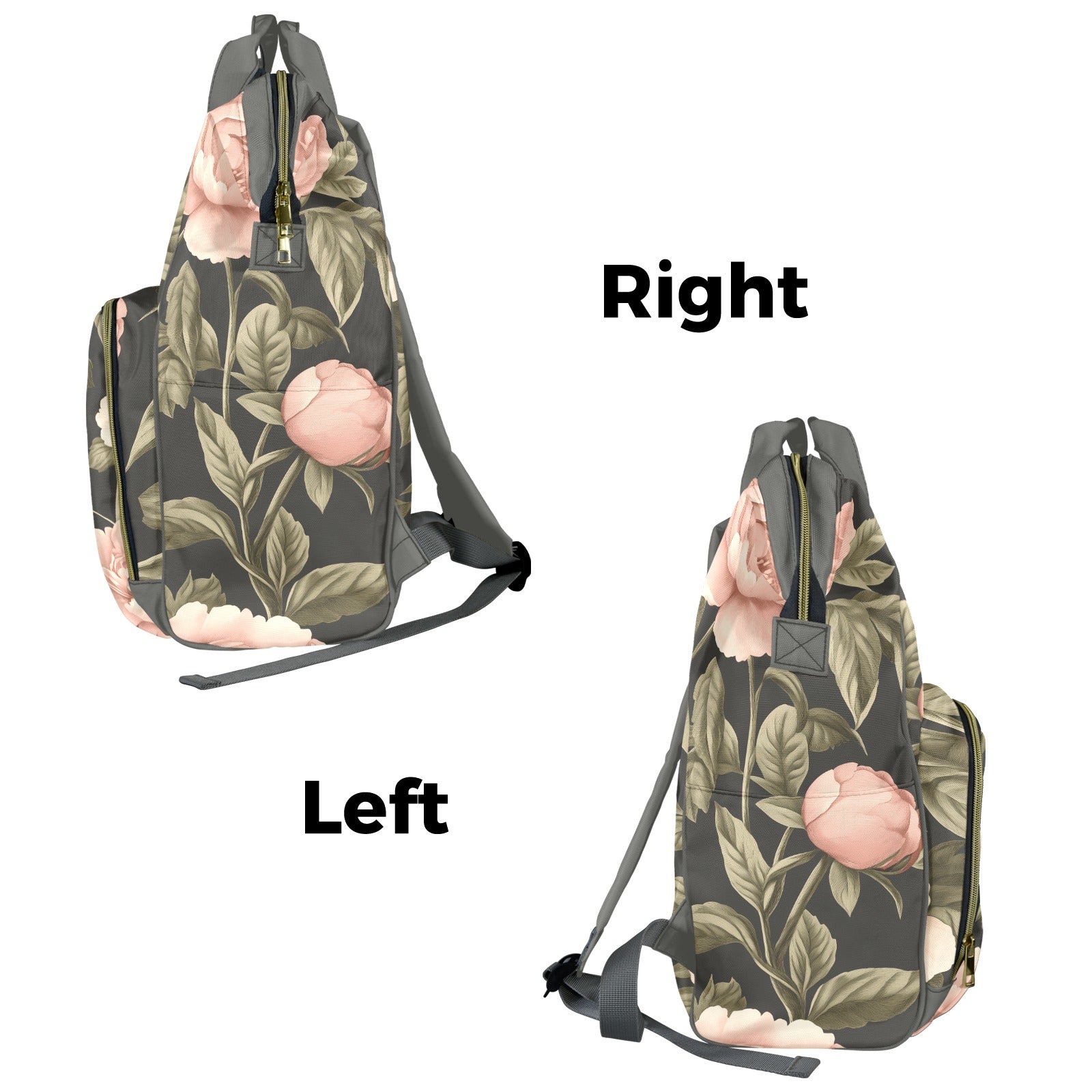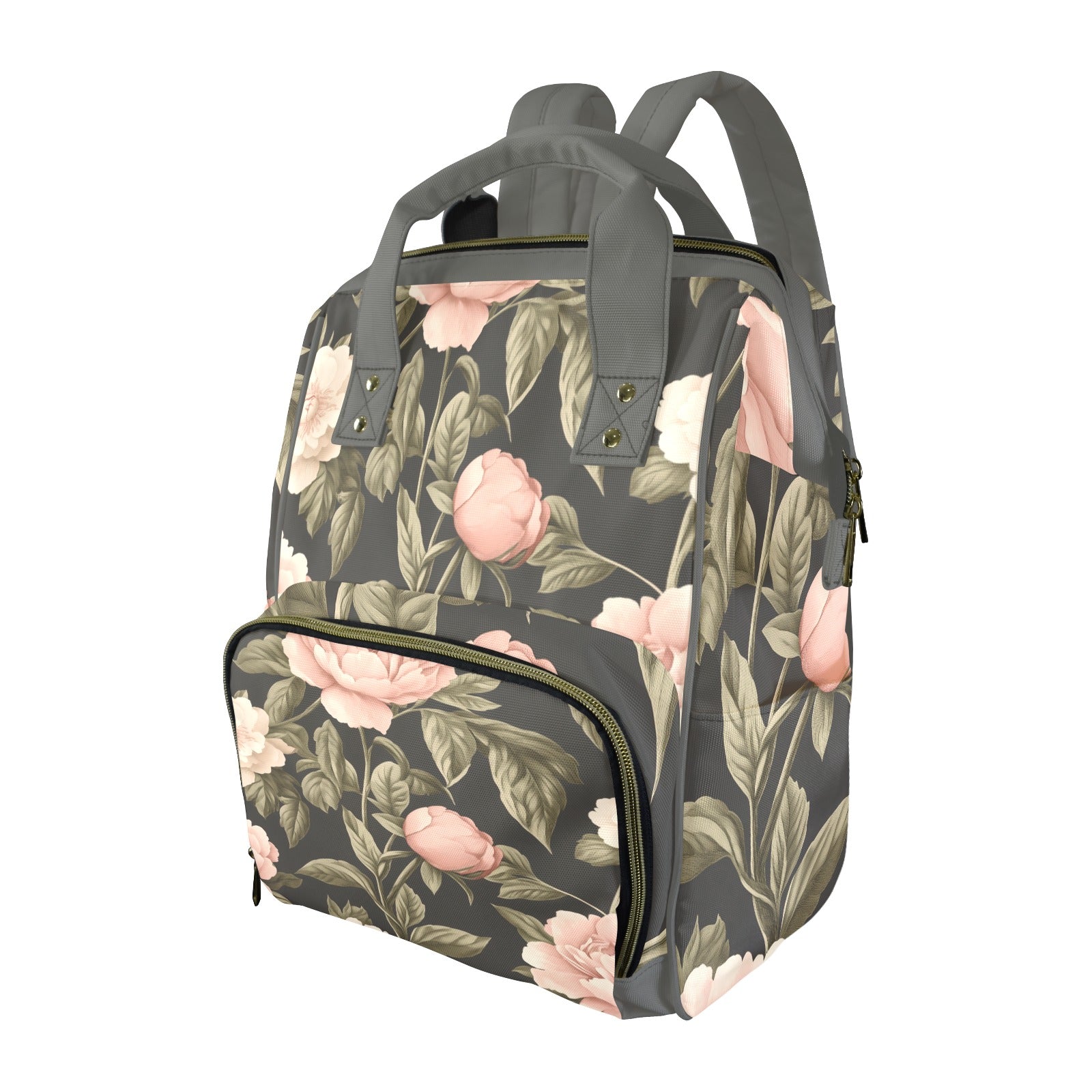 Indulge in the dark romanticism of the Midnight Victorian Bloom Premium Backpack. Showcasing a lush arrangement of soft pink peonies against a moody charcoal canvas, this bag brings a touch of vintage elegance to your parenting adventures. It is the perfect companion for moms who want to carry their baby essentials without compromising on their personal style.